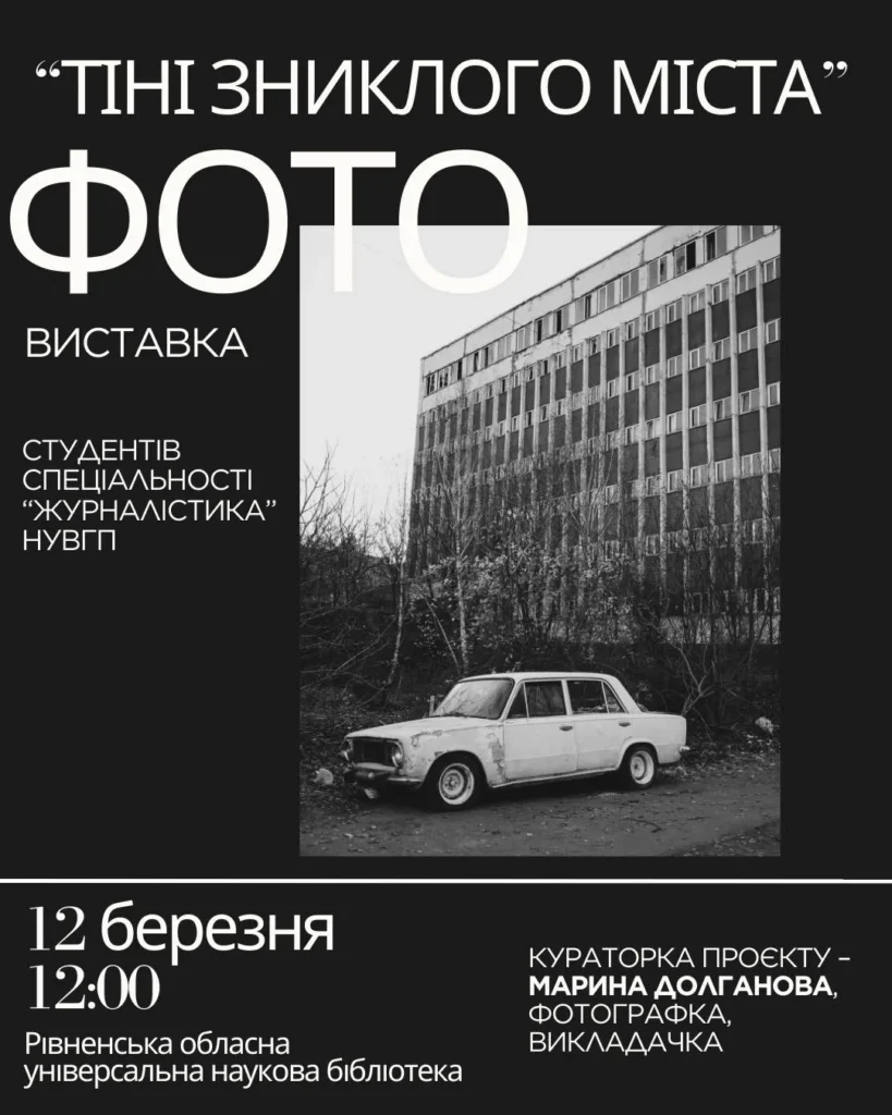 Виставка, створена студентами 2-го курсу спеціальності «Журналістика» НУВГП (кураторка проєкту – Марина Долганова), присвячена просторам Рівного, які поступово зникають із міського ландшафту.