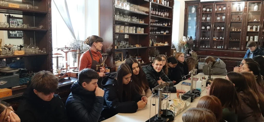 Саме з такою метою викладачі хімії і біології Ігор Капітула та Вікторія Зіняч 15.10.2025р., провели захоплюючу екскурсію рідним містом здобувачам освіти 11-Д та 12-Д груп нашого коледжу. Будинок Мусманів, сквер Волонтерів, Чешський дворик тихо розгорнули нам сторінки своїх цікавих історій. Відвідали найстарішу аптеку-музей м.Рівного, де нам розповіли історію фармацевтики нашого міста. Старовинні медичні інструменти, колби та пробірки дивилися з поличок стародавніх шаф на нас крізь призму часу і гомоніли про виготовлення ліків минулих століть, про магію хімічних перетворень речовин та рослин, які використовували для лікування різних захворювань. Історія медичних інструментів повернула нас у часи досліджень, експериментів та винаходів сторічної давнини, а то і ще давніше…