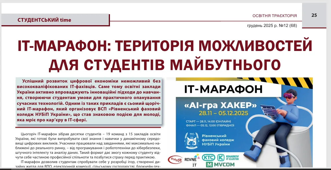 У грудневому випуску інформаційного вісника «Освітня траєкторія» ДУ «НМЦ ВФПО» спільно із закладами фахової передвищої освіти підбиває підсумки року, який знову випробовував нас на міцність, але не зміг зупинити наш рух. Державній установі…