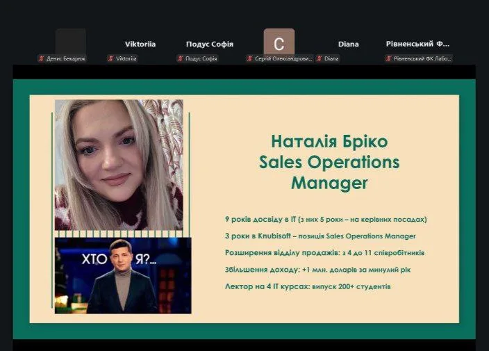 Спікеркою події виступила Наталія Бріко, Sales Operations Manager компанії KnubiSoft, яка має 9 років досвіду в IT, з яких 5 років — на керівних посадах, та 3 роки працює в KnubiSoft. У своїй професійній діяльності вона масштабувала відділ продажів з 4 до 11 співробітників, забезпечила зростання доходу компанії на понад 1 млн доларів за минулий рік, а також є лекторкою чотирьох IT-курсів, випускниками яких стали понад 200 студентів.