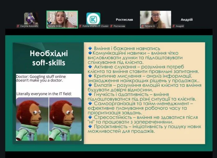 Значну увагу приділено розвитку soft skills, необхідних для успішної роботи в IT-продажах, серед яких: комунікаційні навички, активне слухання, критичне мислення, емпатія, гнучкість, самоорганізація, стресостійкість та проактивність.