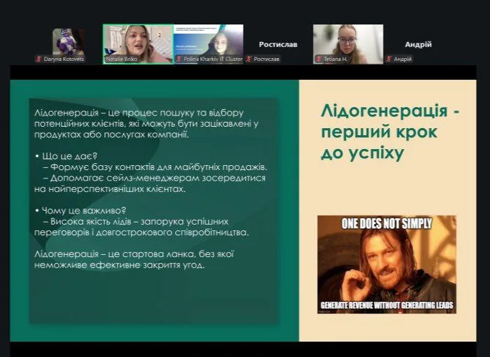 Окремий блок було присвячено лідогенерації як першому кроку до кар’єри в IT. Було пояснено її значення для бізнесу, вплив якості лідів на успішність переговорів і роль лідогенерації як стартової ланки в побудові ефективних продажів.
