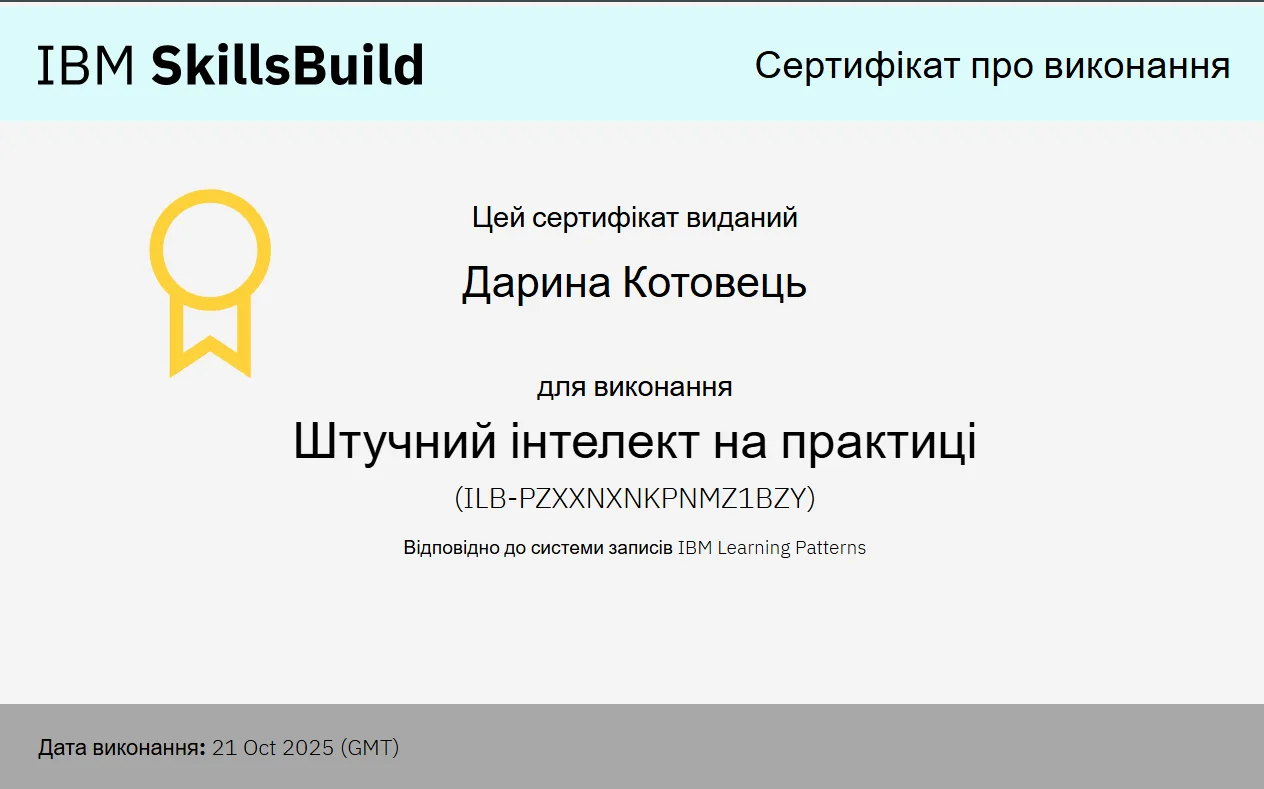 З 11 по 31 жовтня студенти другого курсу відділення інформаційних технологій ВСП «РФК НУБіП України» разом із викладачем програмування та інформаційних дисциплін Юлією Дедюхіною взяли активну участь у міжнародному навчальному курсі IBM SkillBuild, спрямованому на розвиток цифрової грамотності, критичного мислення та професійних навичок XXI століття.