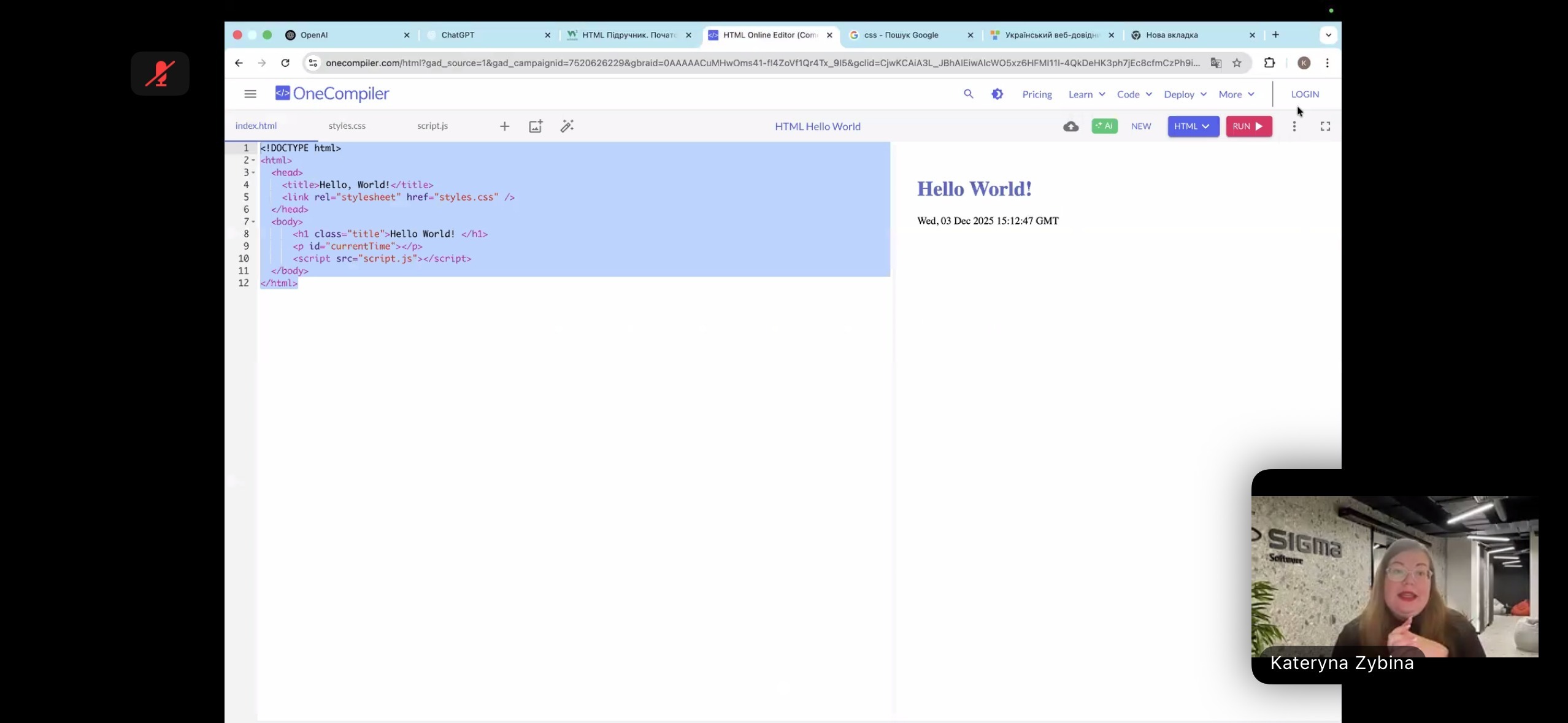 Спікерка також продемонструвала роботу у вебредакторі OneCompiler, який дозволяє писати HTML, CSS і JavaScript в одному вікні та одразу бачити результат. Це допомогло студентам швидко зрозуміти логіку взаємодії коду та відображення у браузері.