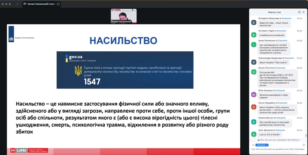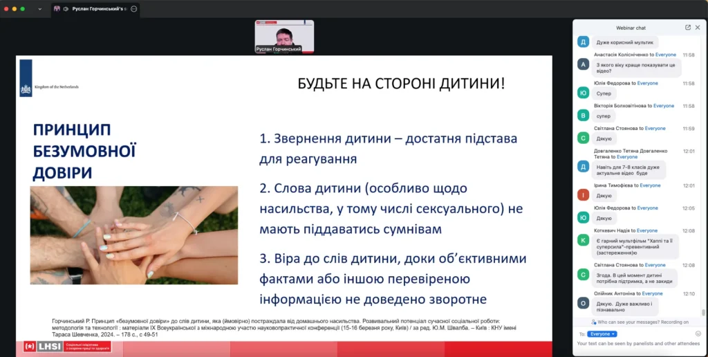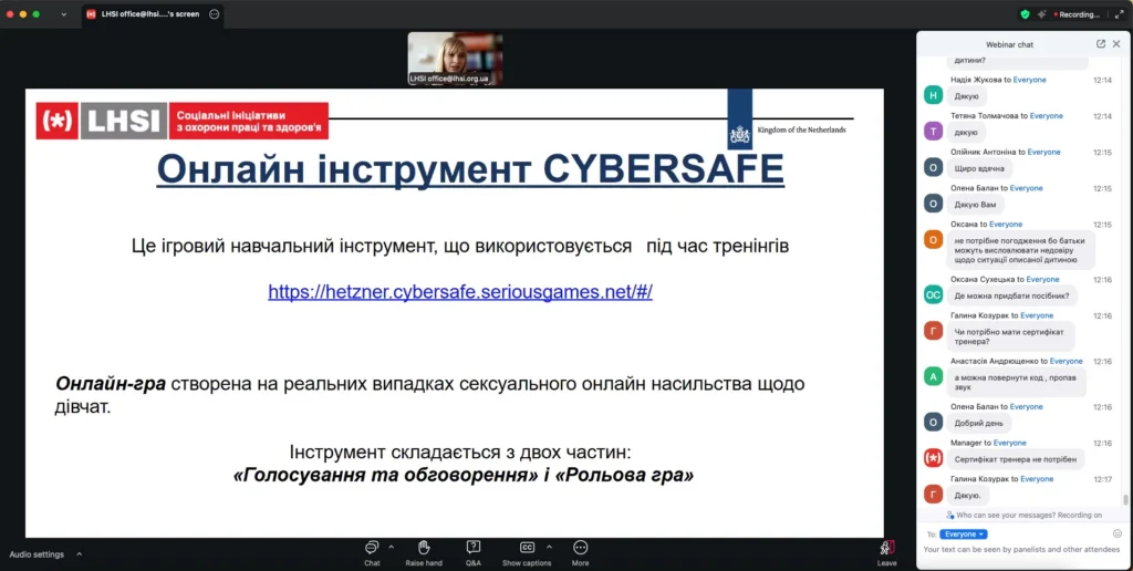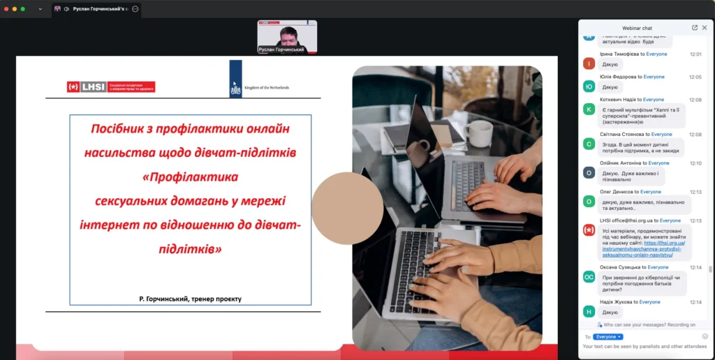 04.03.2026 був проведений вебінар відповідно до листа Міжнародної громадської організації «Соціальні ініціативи з охорони праці та здоров’я» від 18.02.2026 № 2026/02-11-03 інформуємо. Вебінар проводився з теми профілактики онлайн-насильства щодо дівчат-підлітків у межах проєкту «Cybersafegirls – цифрова безпека українських дівчат». Мета проєкту – забезпечення гендерної рівності українських підлітків, попередження сексуального насильства дівчат-підлітків у інтернет-мережі, а також підвищення рівня обізнаності із зазначених питань спеціалістів із захисту прав дітей, вчителів та батьків.