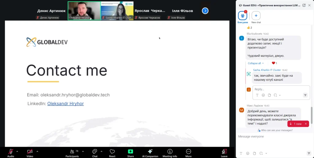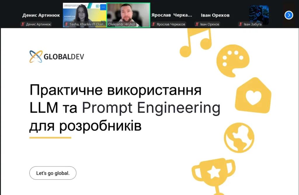 19 грудня 2025 року спільнота Kharkiv IT Cluster спільно з Globaldev Group провела гостьову онлайн-лекцію на тему «Практичне використання LLM та інженерія промптів для розробників», присвячену сучасним інструментам штучного інтелекту та практичній роботі з великими мовними моделями. Захід відбувся в онлайн-форматі на платформі Zoom.