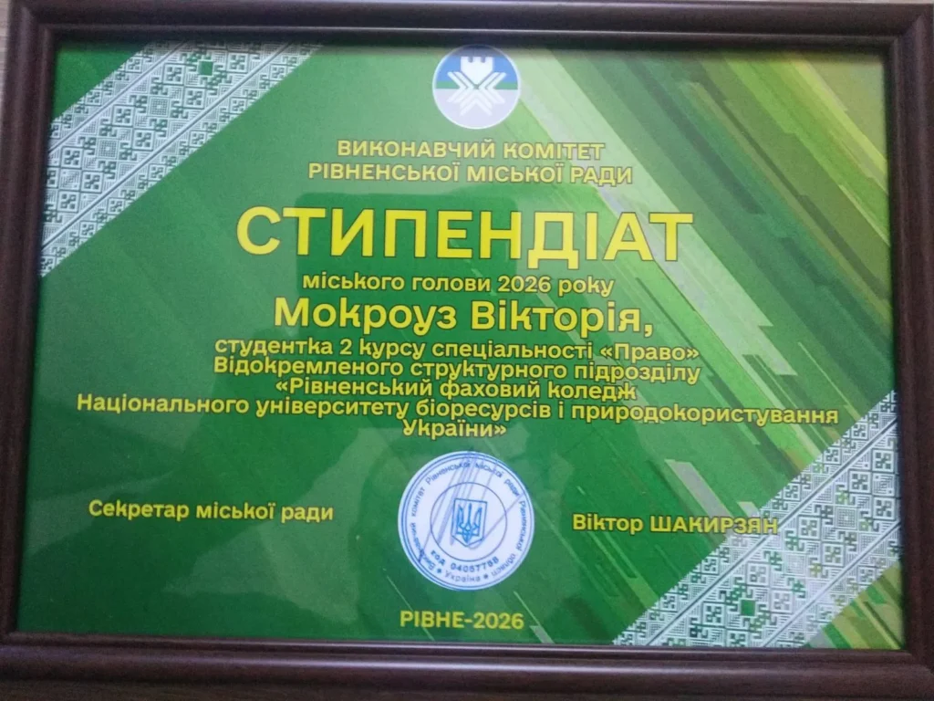 У Рівному відзначили талановиту молодь — секретар Рівненської міської ради Віктор Шакирзян вручив сертифікати стипендіатам міського голови. Серед них і студентка земельного-правового відділення нашого коледжу, якою ми щиро пишаємося.