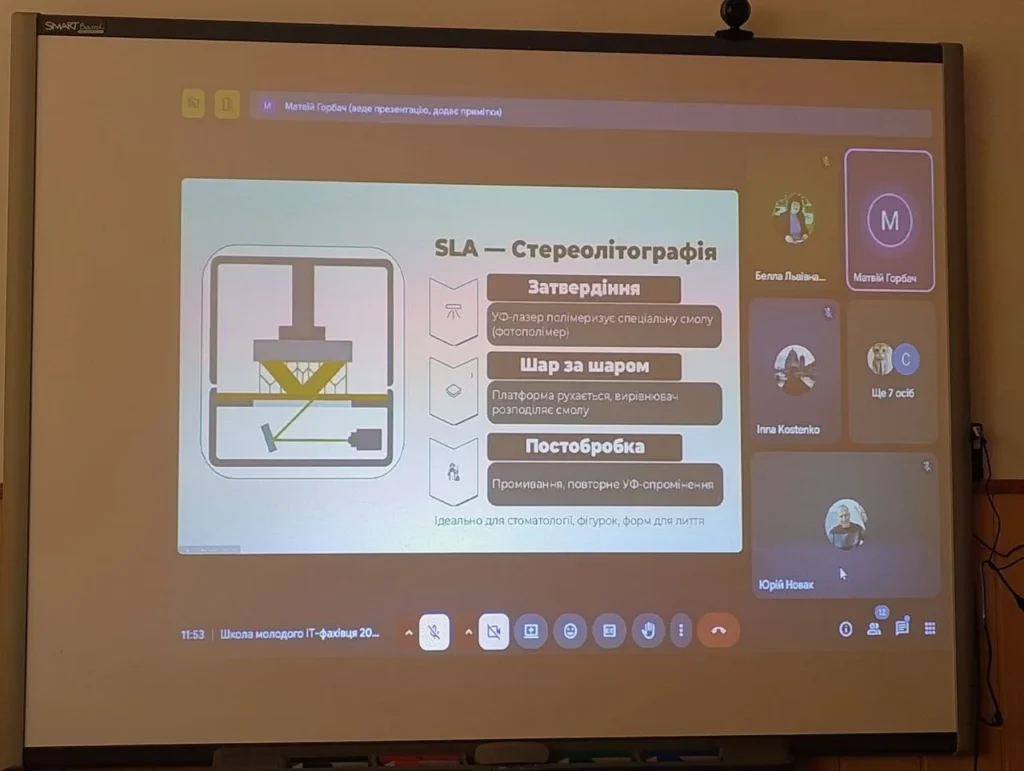 Вебінар дозволив учасникам зрозуміти основні переваги 3D-друку порівняно з традиційними методами та розглянути різні технології, зокрема DLP (технологія цифрового світлопроцесування), SLM (вибіркове лазерне плавлення), FDM (моделювання пошаровим наплавленням) і SLA. Окремо спікер пояснив, де шукати 3D-моделі (найчастіше у форматі STL), які є обов’язковою умовою для друку, та порадив безкоштовні сайти для їх завантаження. Далі учасникам було представлено програмне забезпечення, яке використовується для підготовки файлів до друку. Матвій Горбач продемонстрував безпосередньо процес друку, зокрема заправляння філаменту в 3D-принтер.
