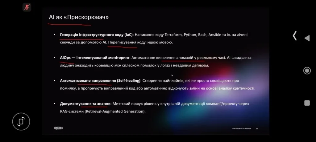 Завершальна частина вебінару була присвячена впливу ШІ на професію. GitHub Copilot, інструменти для автоматизації моніторингу, AI-assisted incident response — все це вже не фантастика, а повсякденність для команд у провідних компаніях. Андрій Костромицький наголосив: ШІ не витісняє DevOps-інженерів, але суттєво змінює профіль їхніх задач. Рутинні операції автоматизуються, натомість зростає попит на системне мислення, архітектурні рішення та вміння працювати з AI-інструментами як з частиною робочого процесу.